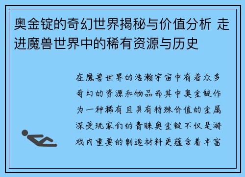 奥金锭的奇幻世界揭秘与价值分析 走进魔兽世界中的稀有资源与历史